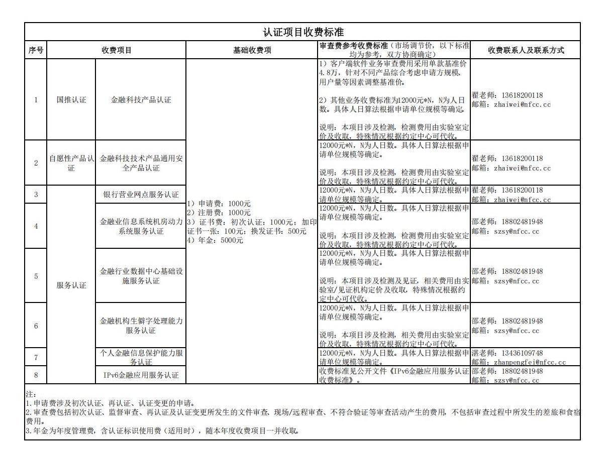 认证项目收费标准