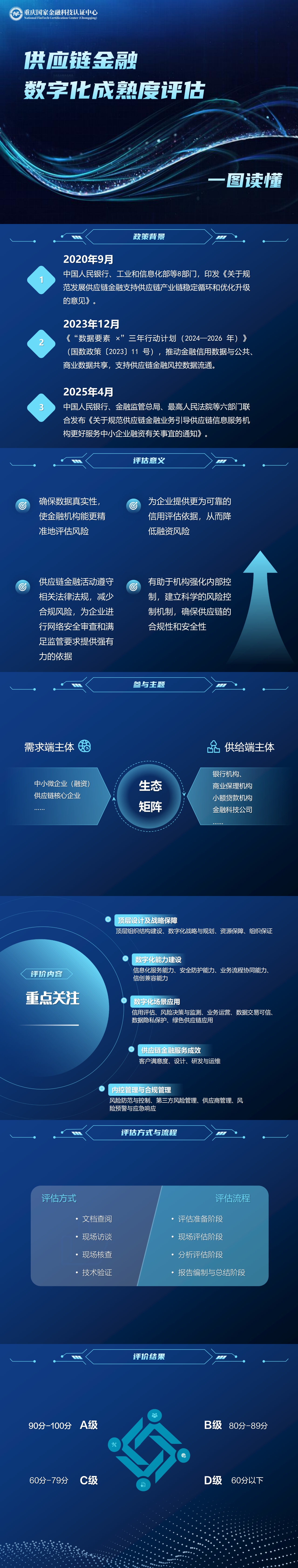 近期,中国人民银行、金融监管总局、最高人民法院、国家发展改革委、商务部、市场监管总局联合印发了《关于规范供应链金融业务 引导供应链信息服务机构更好服务中小企业融资有关事宜的通知》(银发〔2025〕77 号,以下简称《通知》)。《通知》自 2025 年 6 月 15 日起施行。《通知》的出台,将进一步规范供应链金融业务,引导供应链信息服务机构更好地服务中小企业融资,促进供应链金融健康发展,为实体经济注入新的活力。同时,重庆国家金融科技认证中心推出“供应链金融数字化成熟度评估”项目,旨在评估金融机构或平台在应用金融科技进行供应链金融数字化转型的程度和能力,拓宽信用基础、打破核心企业依赖、提升信息透明度与风控能力。未来计划推出“企业供应链金融信用等级评价”、“供应链金融信息安全评估”,持续优化完善供应链金融风险管理的维度和深度,提升供应链金融全生命周期的风险管理能力。